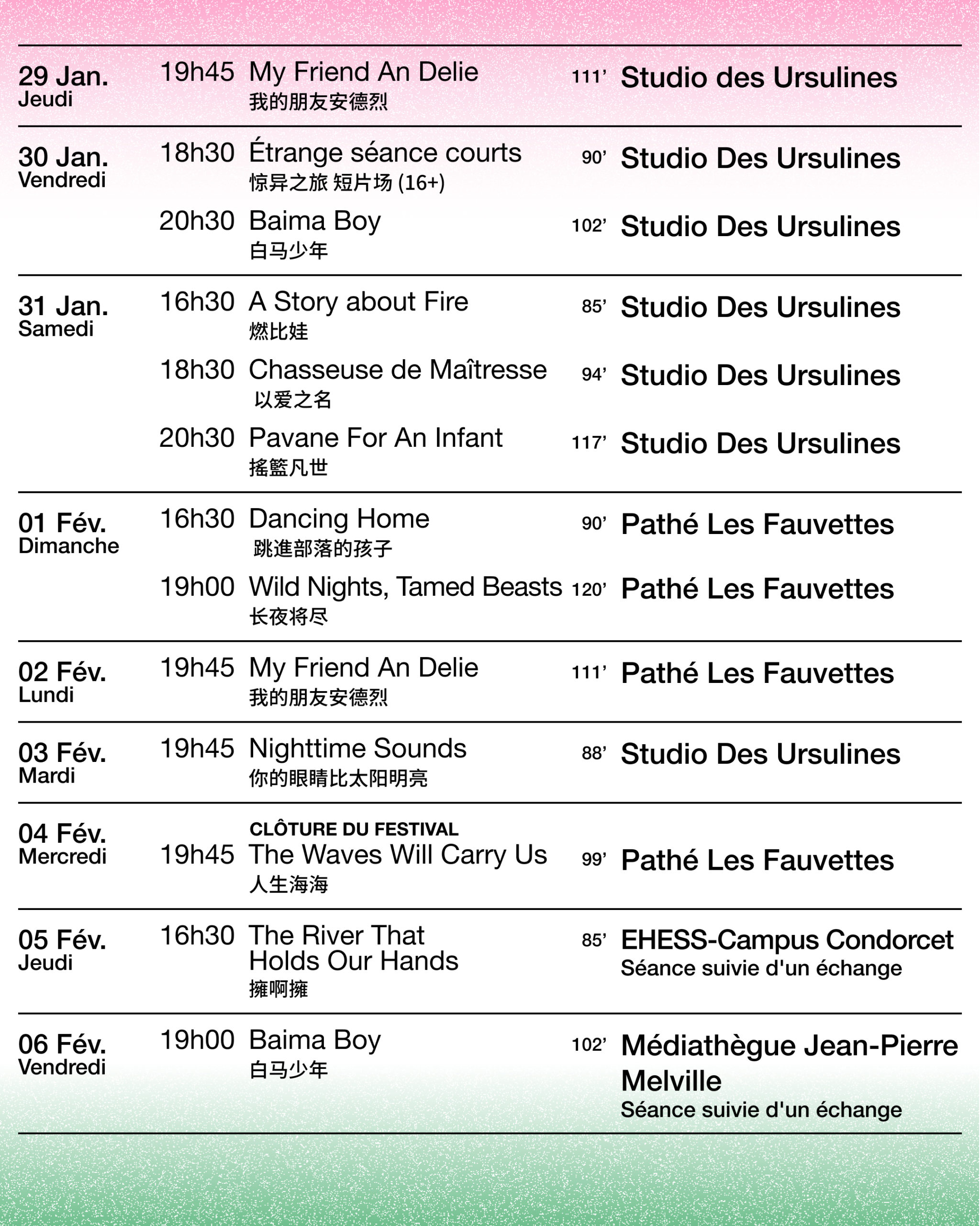 Pour sa 8e édition, les projections auront lieu à Paris au Guimet – musée national des arts asiatiques, au Studio des Ursulines et au Pathé Les Fauvettes. Le Festival se tiendra également à Lyon au Lumière Fourmi.